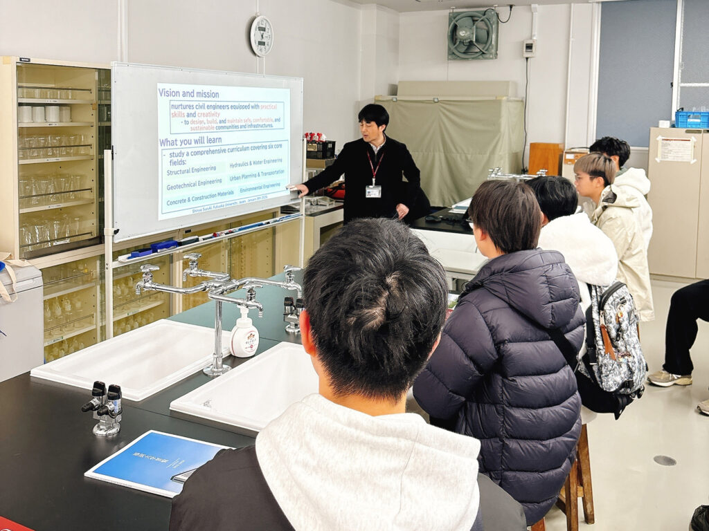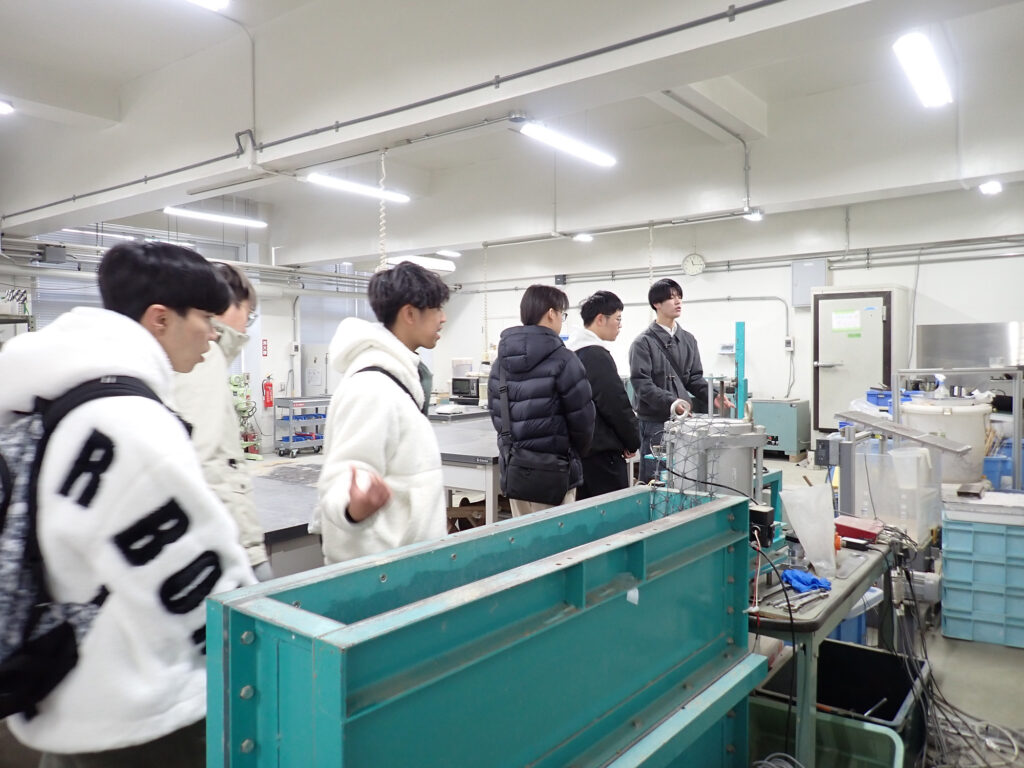 今回の交流会では、まず教員による学科概要の説明が行われ、日本の土木工学分野の教育・研究の特徴や、次世代を担う社会デザインの方向性について紹介しました。続いて、研究室や学生実験の設備を見学。社会インフラの維持や環境に配慮したまちづくりなど、学生が取り組む多様な研究テーマについて意見を交わしました。